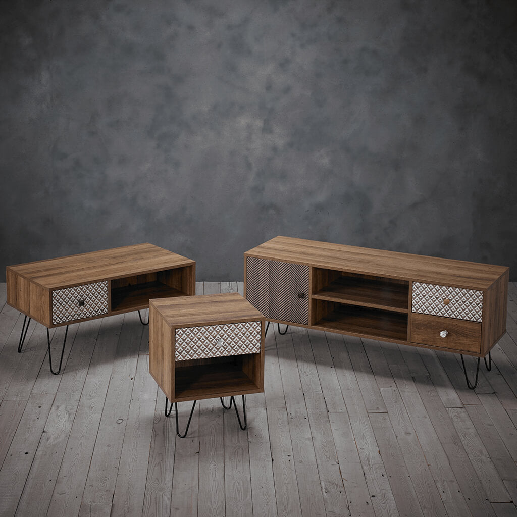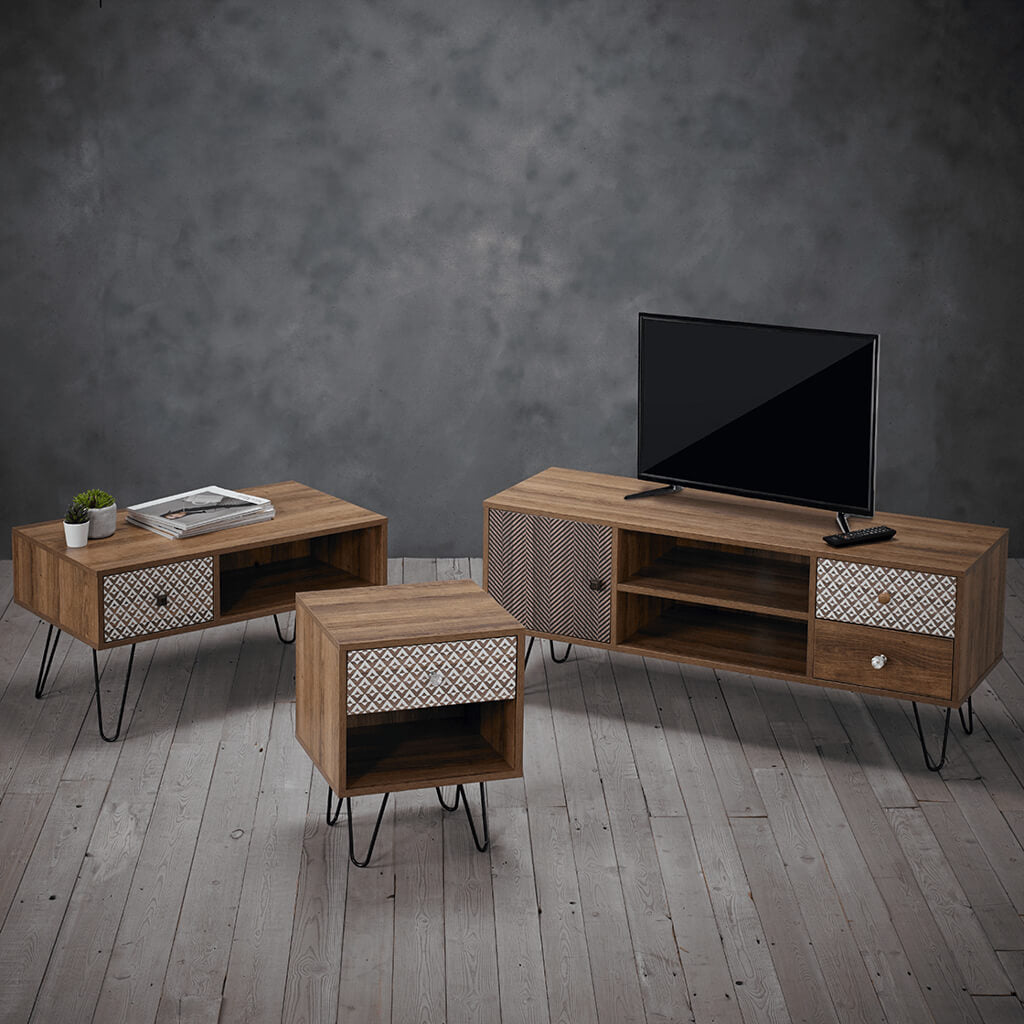 The Casablanca Dark Oak TV Media Unit combines modern design with a hint of retro charm. Standing on sleek black wired legs, it features two small drawers, two open shelves, and a spacious cupboard — perfect for storing media devices, remotes, and accessories. Crafted from durable particle board with a dark oak wood-effect finish, the Casablanca adds a contemporary yet timeless touch to any living space.
